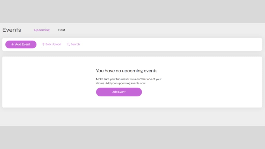 Next, visit the Events section and make sure that all of your upcoming shows are listed accurately—this is the data Spotify uses to retrieve your events. There is no limit or restriction to the number of events that can be displayed. If you notice that one of your upcoming events is missing, add your event.