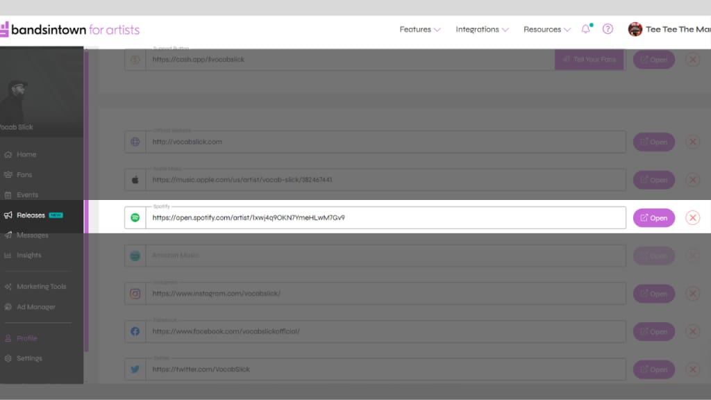 From your Bandsintown for Artists dashboard, click on Profile then to Links and add your Spotify artist profile URL (learn how to find your Spotify artist profile URL).